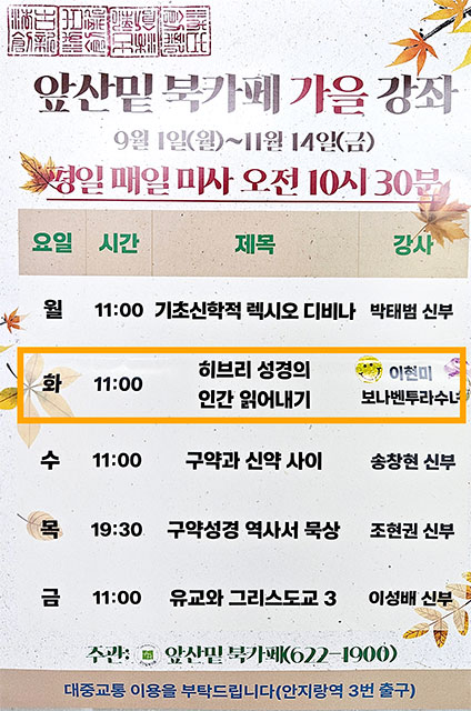 [모집] 앞산 밑 북카페 가을 강좌 – 이 보나벤뚜라 수녀2025년 9월 1일/카테고리: 수녀원 소식 9월부터 11월까지 매주 수요일, 앞산 밑 북카페에서 이 보나벤뚜라 수녀님이 ‘히브리 성경의 인간 읽어내기’로 상반기에 이어 계속 강좌를 이어갑니다.관심 있으신 분들의 많은 참여 부탁드려요~! Related Posts:[모집] 앞산 밑… https://benedictine.or.kr/wp-content/uploads/2025/09/앞산밑북카페.jpg 381 640 집지기 https://www.benedictine.or.kr/wp-content/uploads/2019/04/newlogo2.png 집지기2025-09-01 10:10:572025-09-01 10:11:47[모집] 앞산 밑 북카페 가을 강좌 – 이 보나벤뚜라 수녀