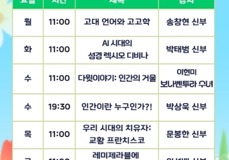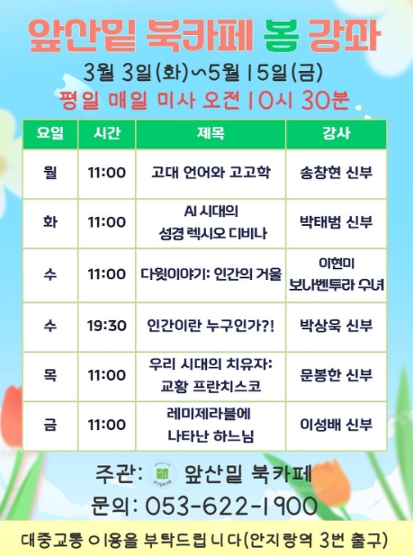 앞산 밑 북카페 봄 강좌 – 이 보나벤뚜라 수녀님2026년 2월 18일/카테고리: 수녀원 소식 앞산 밑 북카페 봄 강좌에 이 보나벤뚜라 수녀님께서‘다윗이야기: 인간의 거울’ 이라는 주제로 강의가 예정 되어 있습니다.자세한 내용은 포스터 내용을 확인하시고관심 있으신 분들의 많은 참여 부탁드려요~! Related Posts:[모집] 앞산 밑…[모집] 앞산 밑…첫서원 - 이 루치아 수녀님종신서원 - 김 루아 수녀님케냐 나이로비 선교사…선교사 파견 - 이…[부고] 이 엘리지아…[부고] 하만옥 말셀라…하 말셀라 수녀님 장례 5.4-7[부고] 김옥춘 안젤라…[부고] 김정애…월요강의 - 임 에디트… https://benedictine.or.kr/wp-content/uploads/2026/02/앞산-밑-북카페-봄-강좌.jpg 618 459 집지기 https://www.benedictine.or.kr/wp-content/uploads/2019/04/newlogo2.png 집지기2026-02-18 10:21:232026-02-18 10:22:03앞산 밑 북카페 봄 강좌 – 이 보나벤뚜라 수녀님