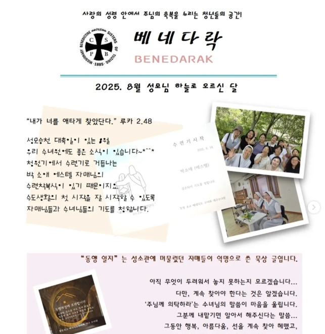 8월 베네다락 소식지2025년 8월 14일/카테고리: 다락풍경 View this post on Instagram A post shared by 베네다락 : 베네딕도 청년 사목(성소 식별) (@benedarak) Related Posts:6월 베네다락 소식지7월 베네다락 소식지9월 베네다락 소식지2월 베네다락 모임3월 베네다락 모임4월 베네다락 모임[모집] 베네다락, 베네청년독서 모임5월 베네다락 모임6월 베네다락 모임8월 베네다락12월 베네다락,…젊은이 화요L.D., 1월 베네다락 https://benedictine.or.kr/wp-content/uploads/2025/08/8월-소식지.jpg 662 643 집지기 https://www.benedictine.or.kr/wp-content/uploads/2019/04/newlogo2.png 집지기2025-08-14 11:05:062025-08-14 11:05:098월 베네다락 소식지
