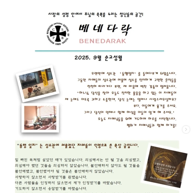 9월 베네다락 소식지2025년 9월 21일/카테고리: 다락풍경 View this post on Instagram A post shared by 베네다락 : 베네딕도 청년 사목(성소 식별) (@benedarak) Related Posts:6월 베네다락 소식지7월 베네다락 소식지8월 베네다락 소식지2월 베네다락 모임3월 베네다락 모임4월 베네다락 모임[모집] 베네다락, 베네청년독서 모임5월 베네다락 모임6월 베네다락 모임8월 베네다락12월 베네다락,…젊은이 화요L.D., 1월 베네다락 https://benedictine.or.kr/wp-content/uploads/2025/09/9월.jpg 641 641 집지기 https://www.benedictine.or.kr/wp-content/uploads/2019/04/newlogo2.png 집지기2025-09-21 09:07:102025-09-21 09:07:129월 베네다락 소식지