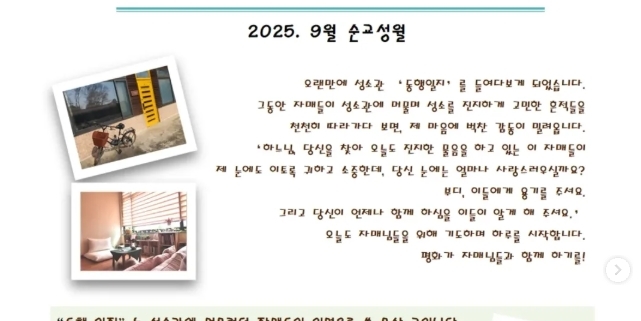 9월 베네다락 소식지 2025년 9월 21일/0 코멘트/카테고리: 다락풍경 /작성자: 집지기 View this post on Instagram A post shared by 베네다락 : 베네딕도 청년 사목(성소 식별) (@benedarak) 이전글 다음글 https://www.benedictine.or.kr/wp-content/uploads/2025/09/9월.jpg 641 641 집지기 /wp-content/uploads/2019/04/newlogo2.png 집지기2025-09-21 09:07:102025-09-21 09:07:129월 베네다락 소식지